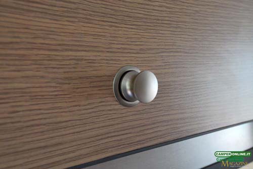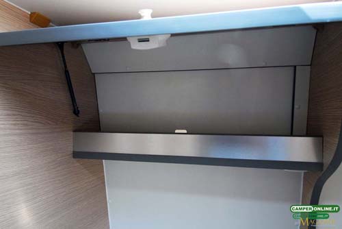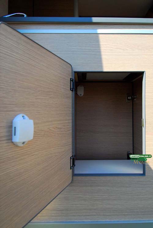 Quest’ultimo vano, su richiesta del cliente, è stato dotato di sportello esterno da 32×4 cm. L’aerazione, infine, può contare sulla finestra (da 75×35 cm) del portellone scorrevole e in parte sull’oblò del living, mentre l’illuminazione artificiale si avvale di una barra a Led installata inferiormente al pensile.