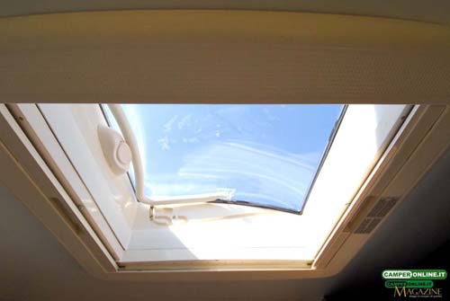 L’aerazione e l’illuminazione diurna possono contare, oltre che sulla vetratura della cabina di guida, su su un oblò Dometic MiniHeki da 40×40 cm e su due finestre Seitz: da 65×35 cm sul lato sinistro e da 75×35 cm su quello destro (quest’ultima a servizio anche della cucina). L’illuminazione artificiale è invece affidata ad una barra a Led installata sotto al pensile.