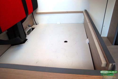 Il letto posteriore beneficia di serie di un materasso in gommapiuma con spessore di 14 cm che appoggia su rete a doghe fissa (il veicolo in prova dispone di un materasso da 10 cm per scelta del cliente).