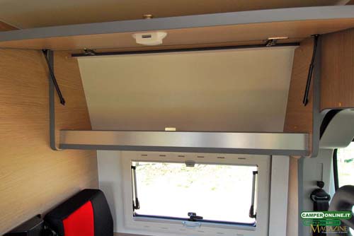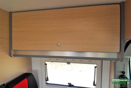 L’allestitore ha mantenuto il padiglione originale del Fiat Ducato, con relativi vani di stivaggio da 66x24x23 cm ciascuno, e l’esemplare in test, non ancora completamente ultimato, manca della consueta finitura lungo la linea di raccordo. Il dislivello tra cabina e pavimento della cellula è di 12 cm, mentre il varco presente tra i sedili è di 145×27 cm.