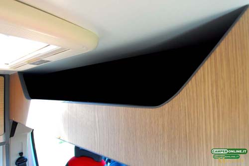 Sempre nella parte superiore dell’abitacolo, all’interno del padiglione della cabina di guida, è disponibile un altro vano di stivaggio a giorno che misura 136x49x20/16.