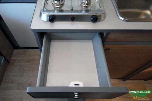 L’impianto del gas, infine, prevede lo spazio per una bombola da 10 Kg ricavato nel mobile cucina e accessibile dall’interno tramite uno sportello da 46.5×65 cm. L’interno misura 46/31×34.5×71 cm ed è attrezzato con un solo aggancio fermabombole. L’aerazione è affidata ad una bocchetta a pavimento da 5 cm di diametro protetta da una semplice retina in nylon e vista la presenza di una sola utenza non è stato previsto alcun sezionatore.