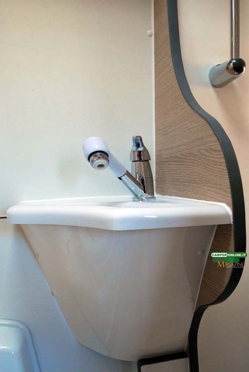 Il vano toilette con un vero box doccia separato, soluzione di pregio su veicoli di questa categoria, dispone di una semplice tenda di separazione, peraltro impiegata in moltissimi altri casi: l’adozione di una antina pieghevole in metacrilato fornirebbe un indiscutibile plus all’intero locale. Anche il piatto doccia sarebbe auspicabile occupasse tutta la pianta del box, anche in virtù dell’installazione della colonna per la doccetta a telefono dal lato dove il piatto doccia manca.