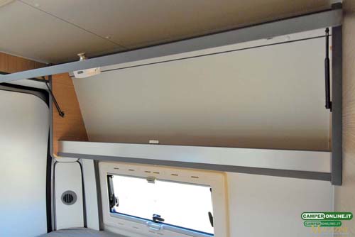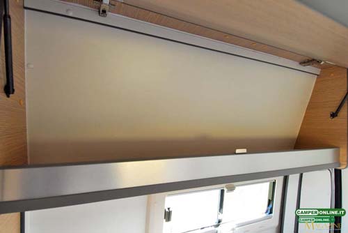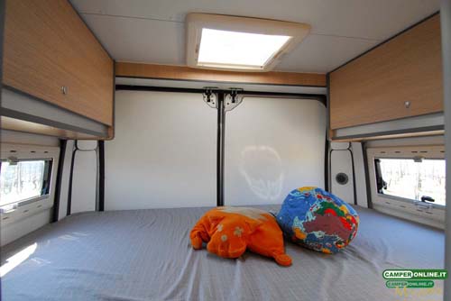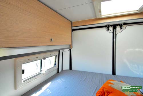 Dotato di rete a doghe fissa per scelta del cliente, il letto è servito da due finestre Seitz Dometic su entrambe le fiancate (optional). Quella di destra è a scorrimento, per evitare interferenze con l’apertura del portellone scorrevole laterale, e misura 60×20 cm, mentre quella posta sulla fiancata sinistra si apre a compasso e misura 60×25 cm. Un oblò MiniHeki Dometic da 40×40 completa la già ottima luminosità e aerazione, mentre il riscaldamento è affidato a due bocchette, una che si trova sotto al letto e l’altra nell’angolo posteriore sinistro.