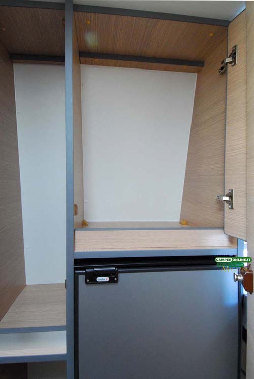Il frigorifero a compressore Indel da 85 litri è collocato a fianco, nella zona riservata agli armadi.