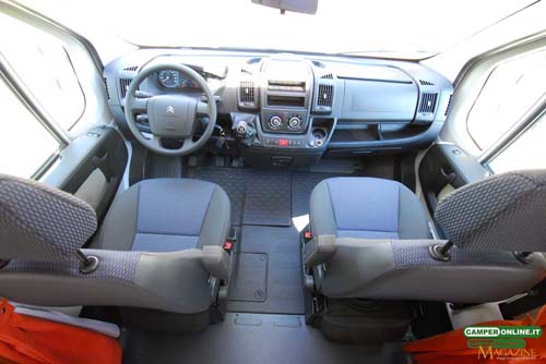 La cabina originale del Jumper, equivalente a quella del Fiat Ducato, è ovviamente garanzia di una agevole accessibilità agli organi del motore attraverso il cofano da 176×53 cm. Ottima anche la visibilità, giocoforza identica a quella del cabinato di serie e garantita dal parabrezza da 176×100 cm, i vetri laterali da 75×68,4 cm e gli specchi retrovisori a doppia ottica da 27×19 e 8×19 cm con braccio opportunamente allungato per consentire di ovviare alla maggiore larghezza della scocca. La pulizia del parabrezza è garantita da due spazzole tergicristallo da 66 e 56 cm.