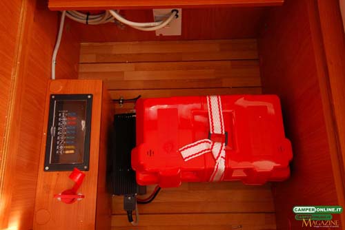 L’impianto elettrico vede l’impiego di un caricabatterie  Nordelettronica NE 143P installato all’interno della cassapanca del divanetto destro del living, dove trovano posto anche la batteria dei servizi (optional), il quadro di distribuzione con fusibili e lo staccabatterie manuale.