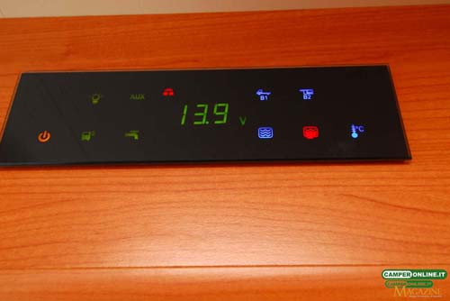Le diverse utenze dell’impianto elettrico sono gestite da un pannello di controllo della Nordelettronica posizionato al di sopra della porta di ingresso. Piuttosto semplice nell’utilizzo e con pulsanti soft touch, dispone di un display digitale per il monitoraggio dei livelli delle batterie e dei serbatoi e affida a icone luminose il controllo delle utenze in uso.