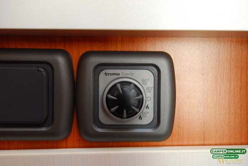 Il riscaldamento è affidato ad una Truma Combi da 4 kW alimentata a gas e alloggiata in un apposito vano situato sotto l’armadio. Facilmente accessibile attraverso uno sportello da 33×41 cm, ha il pannello di comando installato inferiormente al piano di lavoro della cucina e diffonde il calore attraverso sette bocchette ben distribuite all’interno dell’abitacolo.