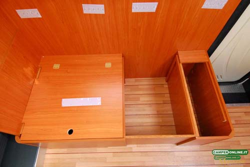 All’interno il vano è molto regolare e vede la presenza di una bocchetta del riscaldamento e di una plafoniera per l’illuminazione. Sul lato destro è presente un vano a giorno da 40x9x9 cm, mentre su quello sinistro, al di sopra della nicchia che ospita la Truma Combi è presente una mensola, poco utilizzabile a causa della mancanza di bordi di ritenuta, da 56×22 cm.
