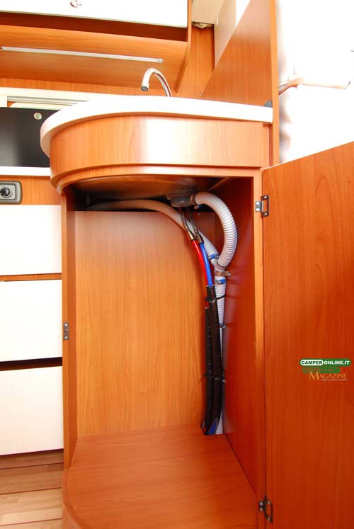 Il vano posizionato sotto al lavello dispone di un’anta curva da 58×72 cm e offre un capiente volume interno di 40x34x70 cm; peccato che non disponga di ripiano divisore volto a ottimizzare lo stivaggio e le tubature di mandata e scarico dell’acqua non siano dotate di alcuna forma di protezione.