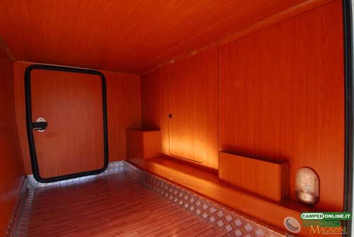 La consueta struttura in acciaio zincato imbullonata posteriormente ai longheroni del Jumper funge da sostegno per il garage posteriore e, vista la minore altezza complessiva, consente di ottenere un piano di carico ribassato rispetto al pavimento del veicolo. L’intero rivestimento della vasca è realizzato in alluminio mandorlato.
