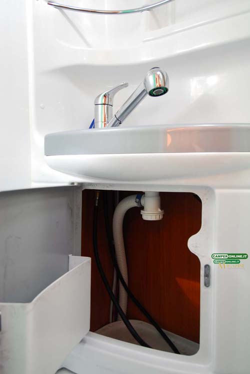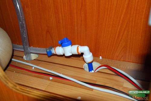 La pompa, una Fiamma Aqua 8 con portata di sette litri al minuto, è alloggiata in un’apposita nicchia ricavata nel serbatoio ed è collegata all’impianto attraverso tubature in Rilsan con raccordi tipo John Guest; solo in piccola parte vengono utilizzati tubi retinati con fascette a vite.