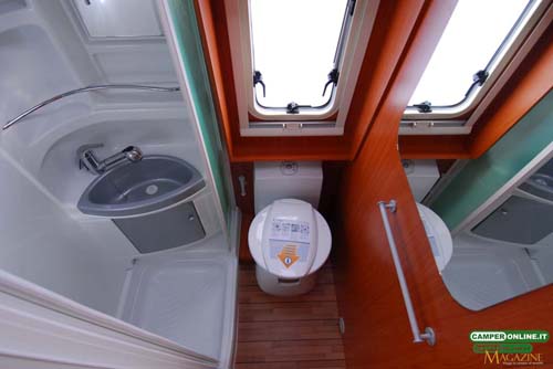 Il vano toilette è ricavato di fronte al blocco cucina, adiacente alla porta di ingresso ed è accessibile attraverso una porta a battente da 193×47.5 cm e superando uno scalino di 10 cm. Misura 113×90 cm ed è corredato di toilette Dometic CT4000 con interno della tazza in ceramica e cassetta estraibile da 18 litri. Sulla destra è presente uno specchio da 50×65 cm e la finestra Polyplastic da 50×32 cm dispone di oscurante e zanzariera.
