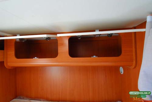 Lo stivaggio nella parte alta fa affidamento a due doppi pensili installati inferiormente al matrimoniale a discesa sul living. Quello presente sul lato destro è servito da due antine da 54.5×27 cm e al suo interno misura 54.5x22x30 cm.