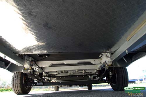 La consueta struttura in acciaio zincato imbullonata posteriormente ai longheroni del Jumper funge da sostegno per il garage posteriore e, vista la minore altezza complessiva, consente di ottenere un piano di carico ribassato rispetto al pavimento del veicolo. L’intero rivestimento della vasca è realizzato in alluminio mandorlato.