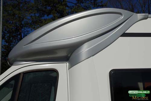 L’integrazione del cupolino con la cabina della meccanica di base è piacevole, seppure denoti qualche leggera imprecisione, e segue idealmente l’inconfondibile sagoma del pronunciato profilo del Citroën Jumper. La sezione centrale verniciata in bianco contribuisce inoltre a spezzare i volumi, slanciandone ulteriormente la linea.