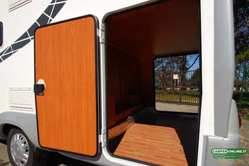 In coda troviamo una delle due aperture del vano garage. Il vano misura 219×115/102.5, con una altezza di 127 cm, e presenta la soglia di carico situata a 59 cm da terra, con la vasca interna in alluminio 8 cm più in basso. Il portellone destro, quello più grande, misura 116×91.5 cm e dispone di un’unica serratura di sicurezza.