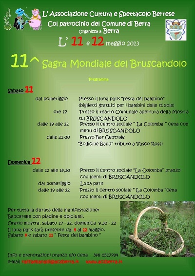 La raccolta del “bruscandolo” era una pratica diffusa ai tempi dei nostri nonni, quando questo saporito prodotto della terra, dal sapore simile all’asparago, era utilizzato in cucina per integrare le povere mense di allora, dando sapore e freschezza a tanti piatti semplici. L’intento della manifestazione è quello di far riscoprire il sapore e l’aroma raffinato di questo arbusto, ma anche di far conoscere ai più giovani le cose semplici di un tempo.I primi riferimenti al bruscandolo nel territorio berrese sono presenti in un documento del fattore ducale di Mesola datato 13 marzo 1736 , in cui dice di aver inviato all’attenzione del commissario ducale di Ferrara “alcuni mazzetti di bruscandoli de’ primi ritrovati”