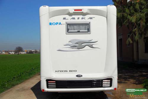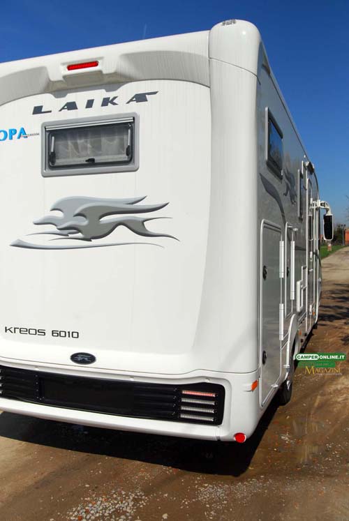 Il look esterno del Kreos 6010 è sicuramente riuscito e piacevole, con le fiancate caratterizzate da linee pulite e da rapporti di forma alquanto proporzionati. Sono però il frontale e la coda a fare la parte del leone e risultano entrambi caratterizzati da una forte personalità, tale da rendere immediatamente riconoscibile il motorhome di casa Laika. Decisamente azzeccata, inoltre, la scelta di offrire il veicolo in tre diverse colorazioni di carrozzeria (bianco, silver e la speciale cabina Laika Fashion Design in fibra di carbonio abbinata a entrambe le colorazioni) e altrettanti tipi di grafica. Di rilievo sia la fanaleria anteriore con luci diurne a led sia quelle posteriore, anche a led e di sicuro impatto visivo.