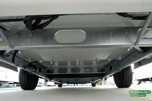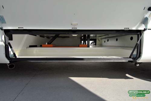 Sorretto da robusti longheroni, naturale prolungamento del telaio Al-Ko, il garage vede la presenza di un pavimento con rivestimento esterno in vetroresina, coibentazione in styrofoam da 15 mm e rivestimento interno con vasca in ABS completa di rinforzo centrale in alluminio mandorlato, il garage si trova a 52 cm dal suolo e offre una portata di 150 kg.