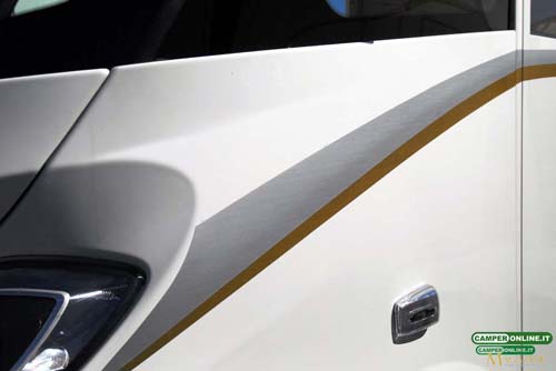 Completano la scocca le bandelle laterali: realizzate in alluminio da 2 mm di spessore, hanno un’altezza massima di 42 cm (cinque nel profilo superiore, 37 in quello inferiore nel quale sono inseriti gli sportelli di accesso al gavone sottopavimento), inglobano i parafanghi posteriori (in abs) dotati di passaruota di tipo industriale e, in coda, lasciano spazio all’elegante paraurti posteriore contraddistinto da luci a LED.