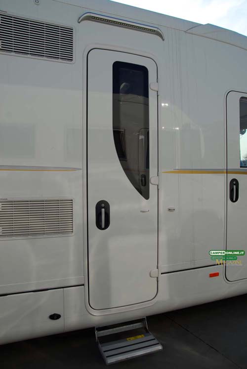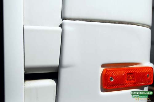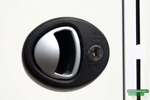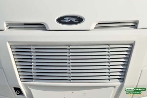 A sinistra della porta trovano collocazione le griglie di aerazione del frigorifero Dometic e, inserito nelle bandelle sottoscocca, uno degli accessi al gavone sottopavimento.