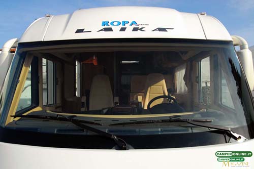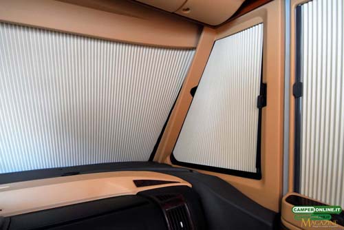 Ottima la vivibilità anteriore e laterale: unici ostacoli sono i montanti anteriori del parabrezza (16 cm), giustificati dalla presenza degli oscuranti laterali plissettati, dotati di camera d’aria interna e realizzati in materiale Dueette. Disponibile in opzione l’ulteriore oscurante elettrico Laika Iso Roll-Up, dotato di movimentazione elettrica e disponibile come optional. Questo sistema, dedicato a coloro che prevedono di utilizzare spesso il veicolo durante la stagione invernale, crea una vera e propria camera d’aria tra i due oscuranti in cui viene immessa l’aria calda proveniente dall’impianto di riscaldamento della cellula proteggendo così la cabina e il letto basculante dai rigori esterni.