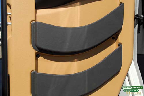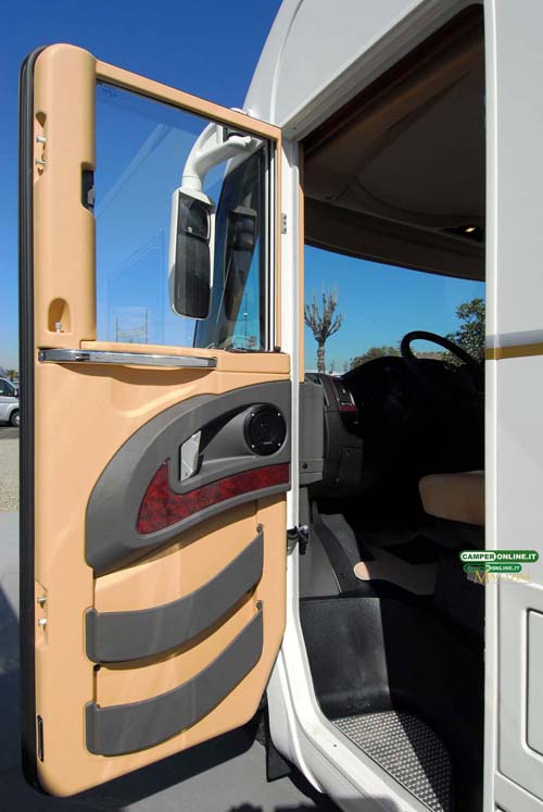 Di serie, il Kreos 6010, così come tutti i nuovi Kreos motorhome, prevede una sola porta in cabina di guida: la porta sul lato destro (presente sul veicolo in prova), infatti, è opzionale, così come lo sono i doppi vetri per le porte stesse.