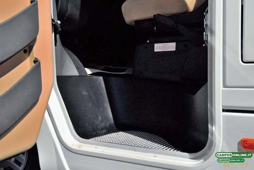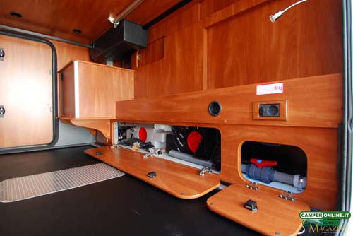 Uno sportello da 57×38 cm, dotato di doppia serratura e con apertura ad ala di gabbiano e pistoncino a gas, permette di accedere a un vano decassato da 58.5x34x35 cm comunicante con la porzione centrale del doppio pavimento del veicolo (175x135x24 cm) e, di conseguenza, anche con l’accesso laterale sinistro (144×38 cm) inserito anch’esso nella bandella laterale a servizio di un vano, anch’esso decassato, da 146x33x35 cm e dotato delle medesime caratteristiche ed equipaggiamenti di quello della fiancata destra.