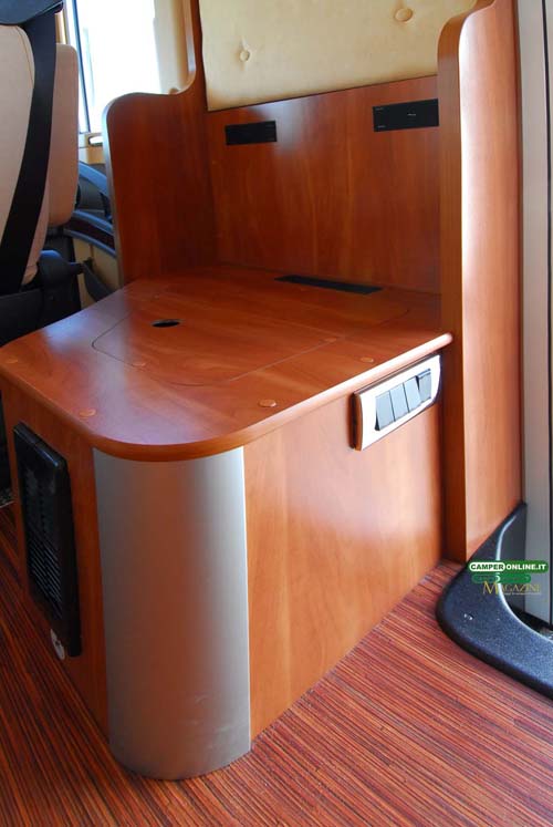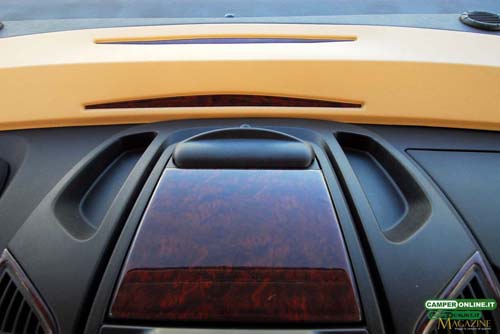 Un valido ausilio a tutto ciò è inoltre fornito dal Laika Thermo Cab System: tra motore e abitacolo, sotto al sovra cruscotto, è infatti posizionato un vero e proprio pannello sandwich studiato per isolare il vano rispetto all’abitacolo, mentre tra questo e il sovra cruscotto, realizzato in materiale nautico soft touch, è condotto il riscaldamento dedicato al parabrezza, distribuito da nove feritoie. Molto importante specialmente in sosta,è poi la presenza di due bocchette parzializzabili allacciate all’impianto Truma Combi, sistemate sulla parte superiore del sovra cruscotto, nelle immediate vicinanze della Iso Roll-Up.