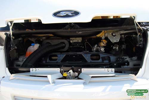 Proprio il cofano, da 229×55 cm, è dotato di meccanismo di apertura a pantografo e guarnizione di tenuta: una volta aperto consente di accedere agli organi meccanici attraverso un varco da 136×36 cm.
