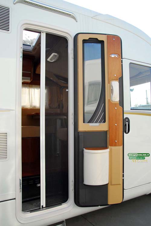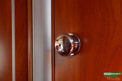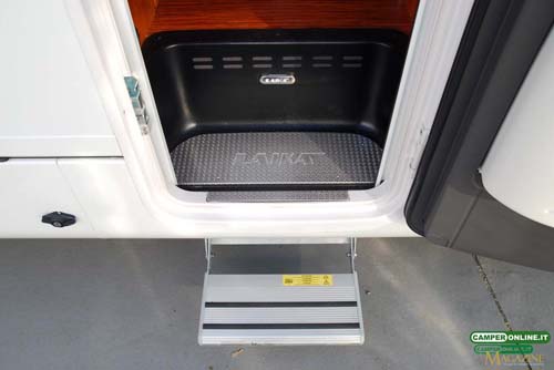 Non mancano, poi, la classica maniglia di cortesia (posizionata sul lato sinistro), la zanzariera scorrevole Dometic e la luce esterna a Led, utile anche come grondaia. In totale, il dislivello complessivo tra suolo e pavimento è di 70 cm.