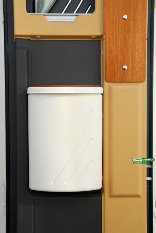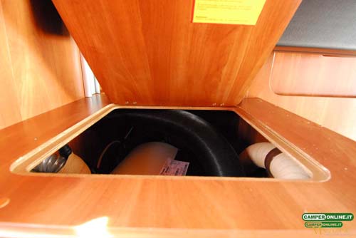A fianco delle griglie di aerazione del frigorifero e superiormente al portello di accesso al doppio pavimento è collocato il vano che ospita il serbatoio mobile del wc Thetford C250.