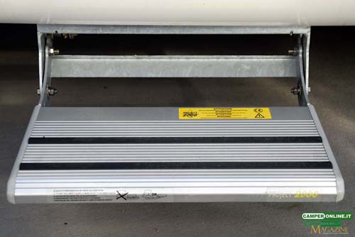 La soglia di ingresso, situata a 44 cm da terra, è servita da un gradino elettrico Project 2000 (53.5×20 cm) che una volta dispiegato si posiziona a 13 cm da terra, e da un gradino integrato da 21x62x26 cm dotato di carter in abs con marcapasso in alluminio mandorlato e griglie di aerazione.