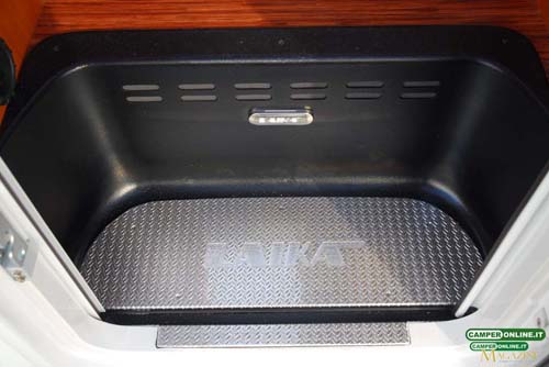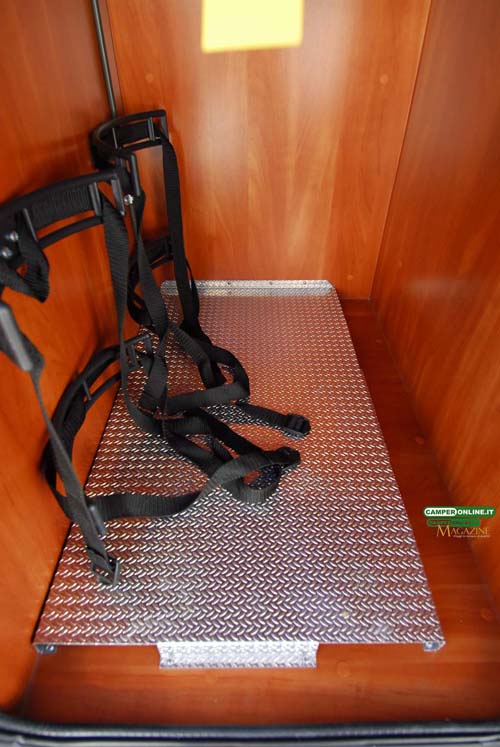 Il vano è completamente isolato rispetto al resto dell’abitacolo ed è riscaldato mediante due bocchette dell’impianto Truma Combi (una sul lato destro, una sul lato sinistro), mentre i portelli sono dotati di sensore che ne segnala l’apertura.