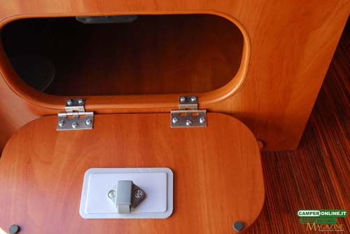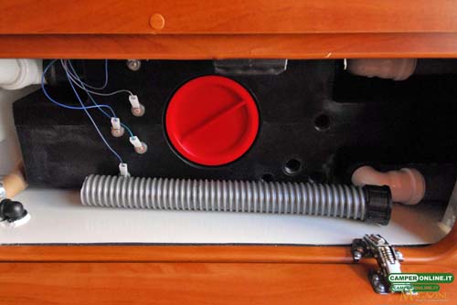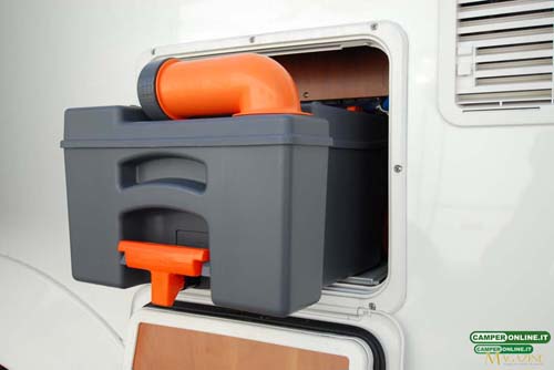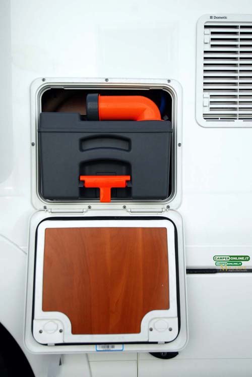 Come visto in precedenza il serbatoio di recupero da 18 litri del wc Thetford C250 è alloggiato sulla fiancata destra, superiormente al portello del gavone passante.
