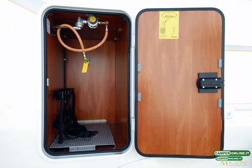 A sinistra della porta, un portello da 80.5×47 cm consente di accedere al vano per le bombole del gas: capace di ospitare due contenitori, il vano misura 74x48x80 cm, si trova a 93 cm da terra e dispone sul fondo di idonea lamiera in alluminio.