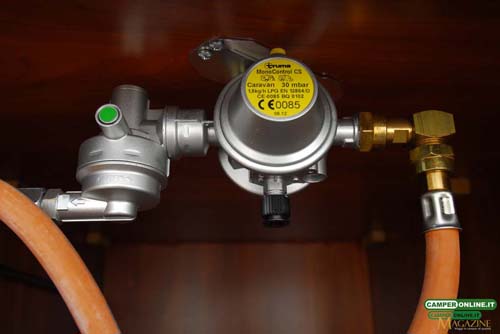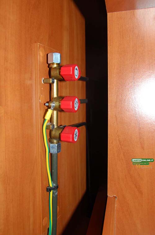 L’impianto del gas, infine, oltre che sul già citato vano per due bombole completo di riduttore di pressione da 30Mb, può contare su tre sezionatori dedicati a frigorifero, riscaldamento/boiler, cucina/forno a gas e installati nella base del blocco cucina, facilmente accessibili.