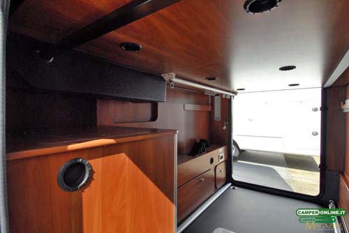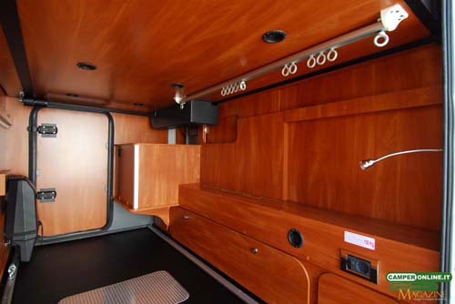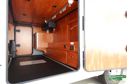 Ampio e regolare nel proprio sviluppo, nonostante la presenza sul lato sinistro del vano della stufa, è dotato di doppio binario laterale per il fissaggio del carico, riscaldamento tramite una bocchetta dell’impianto Truma Combi, illuminazione tramite un tubo a led posteriore e un ulteriore spot led orientabile (lato destro), foro di scolo con tappo, prese di corrente a 12 e 220Volt (lato destro), ganci appendiabiti trasversali.