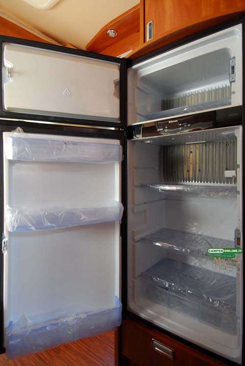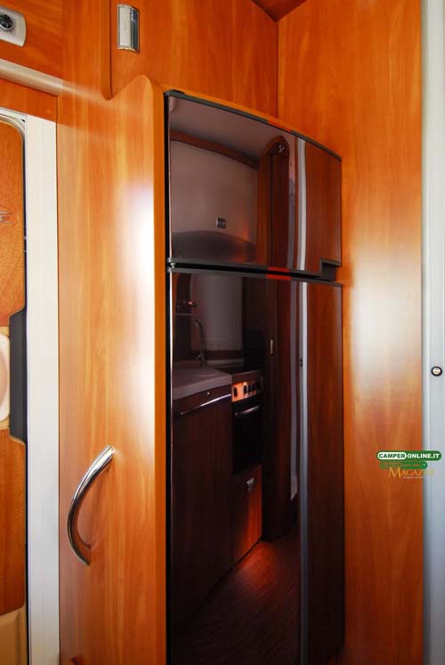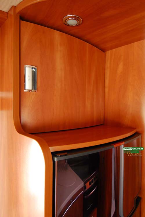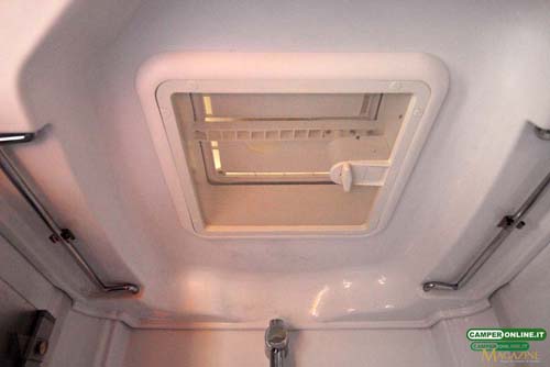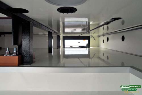 Ancora in ABS è la costruzione della parete posteriore: al tradizionale pannello sandwich da 35 mm alluminio/Styrofoam/multistrato), è infatti associato un monoblocco prestampato esterno che, oltre a dotare lo specchio di coda di forme automobilistiche, ne migliora ulteriormente la coibentazione. Dotato di un profilo superiore, lo stampo è completamente sigillato rispetto al tetto e alla parete “interna” posteriore.