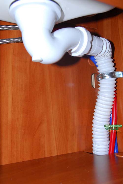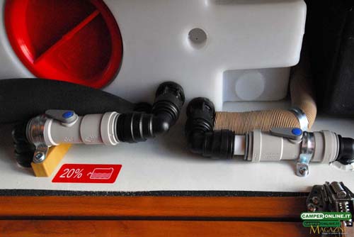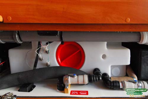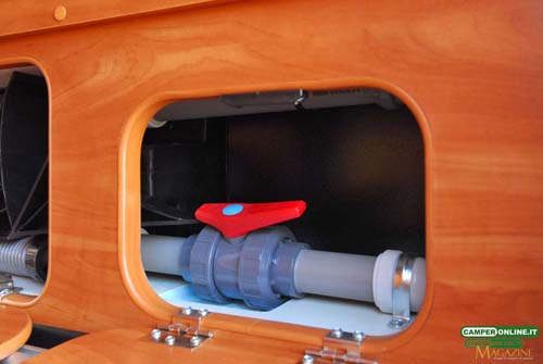 L’autonomia idrica è affidata a un serbatoio da 120 litri (parzializzabile a 20) realizzato in polietilene lineare alimentare e inserito nel doppio pavimento del garage, in corrispondenza dell’asse posteriore, per un corretto bilanciamento dei pesi. Al suo fianco è posizionato il serbatoio di recupero, sempre da 120 litri, ma realizzato in polipropilene nero per evitare la possibile formazione di alghe.
