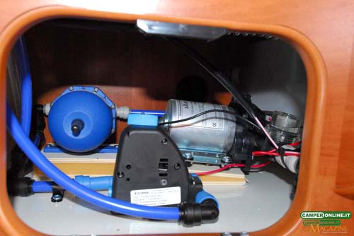 L’impianto dell’acqua potabile è servito da una pompa a pressostato Shurflo Lilie LS204M dotata di vaso di espansione Fiamma A 20, entrambi posizionati su apposito supporto inclinato antivibrazione per una maggiore silenziosità di utilizzo e accessibili attraverso un portello da 25,5×18 cm posizionato sempre nel garage posteriore.