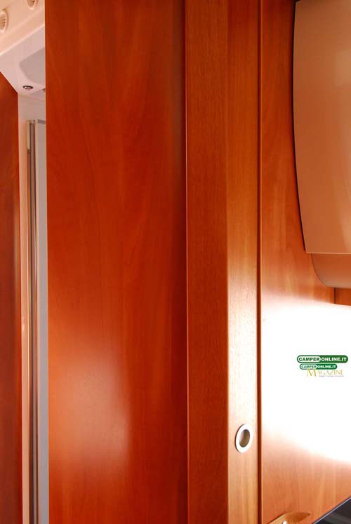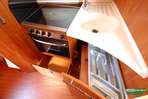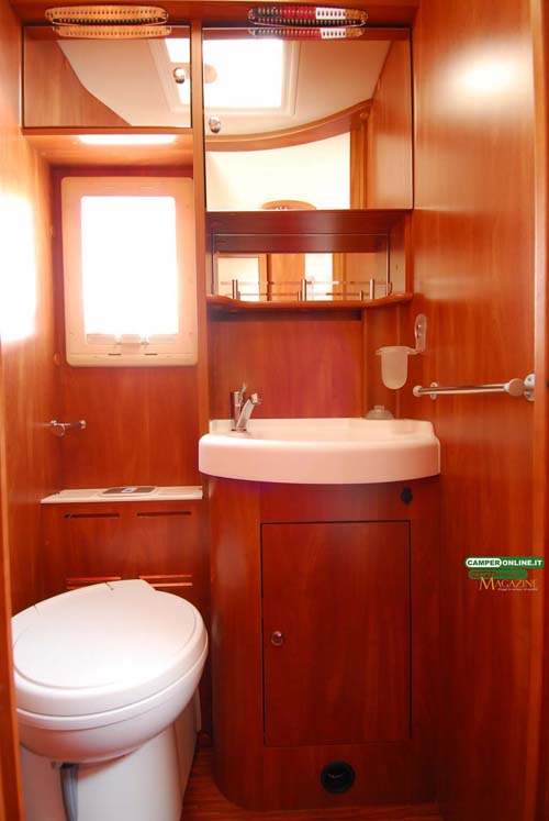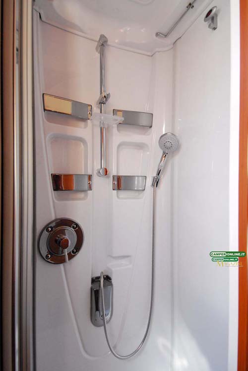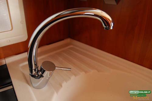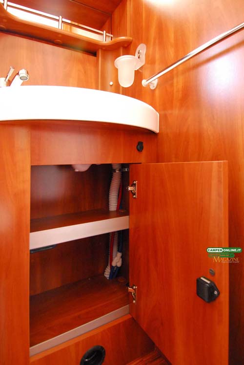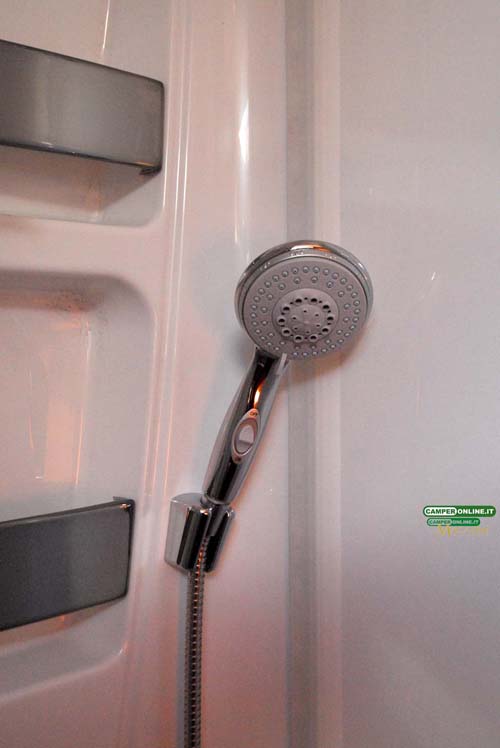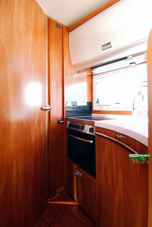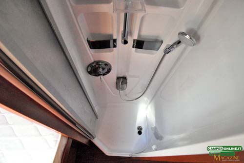 La cucina segue i canoni dell’ultima generazione dei veicoli Kreos e oltre al raffinato e pratico piano in resina offre buone capacità di stivaggio per cambusa e stoviglie. Nulla da eccepire anche riguardo alla toilette, seppure non particolarmente generosa nelle dimensioni, che si rivela non solo elegante ma anche razionale, con una buona aerazione e un ottimo numero di vani per il ricovero degli accessori da toeletta. Analogo discorso per la doccia indipendente, in questo caso di buone dimensioni e ottimamente attrezzata.