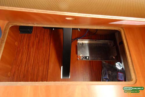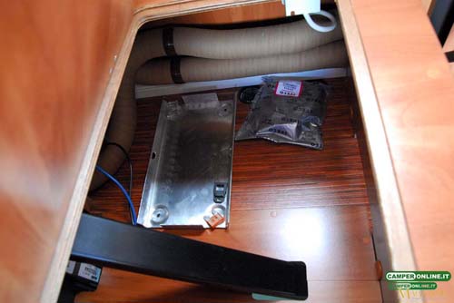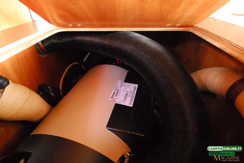 Sempre nel garage, ma sul lato sinistro, un mobile da 63x35x47 cm, situato a 32 cm dal pavimento, ospita al proprio interno la caldaia del riscaldamento Truma: è accessibile superiormente, attraverso una botola da 42×32 cm.