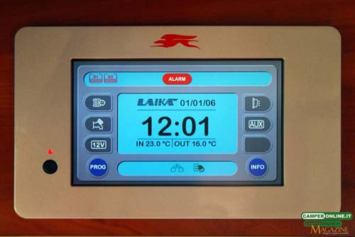 Il pannello, infatti, si compone di una cornice esterna sulla quale, nella parte sinistra, sono posizionati il pulsante di accensione generale e l’apposito led di segnalazione dell’avvenuta accensione, e di uno schermo lcd a colori da 7” dotato di comandi touch-screen. Questo, in particolare, si divide in tre fasce verticali e altrettante orizzontali in modo da differenziare la zona dedicata ai pulsanti di comando da quella pensata per fornire, in tempo reale, le informazioni su tutti gli impianti di bordo. La parte centrale dello schermo, infatti, ospita, oltre al logo Laika, ora e data e, sotto a queste, temperature interne ed esterne rilevate dalle sonde preposte. A destra rispetto all’orologio trovano collocazione tre spie, dedicate all’attivazione della funzione “sveglia”, alla disattivazione dei toni di comando, i segnali acustici che possono essere emessi contestualmente alla pressione di un pulsante di comando, e all’attivazione del timer dell’impianto di riscaldamento, con la possibilità di impostare l’accensione temporizzata della stufa il cui funzionamento, in questa modalità, si attiva per un periodo di due ore: una funzione particolarmente utile nelle mezze stagioni per risparmiare combustibile e, allo stesso tempo, trovare un veicolo caldo e accogliente al proprio ritorno.
