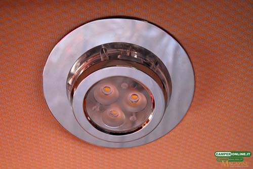 Questa, interamente a led e multivie, per essere comandata da più postazioni, può contare su quattro spot a doppio fascio (bianco e blu – selezionabile solo bianco, solo blu o bianco e blu insieme) inseriti sotto al letto basculante e dedicati alle poltrone cabina, affiancati da altri tre spot centrali e da due tubi led laterali, sempre inseriti nel sottobasculante ma dedicati al living. Questa zona può contare anche su uno spot orientabile inserito sotto al pensile e su un angolare luminoso dello stesso pensile laterale sinistro. Dedicato alla porta di ingresso, e al comando delle utenze elettriche sono posizionati uno spot led superiore richiamato, a terra, da un elegante marcapasso a led blu inserito nel gradino integrato. Ancora spot sono dedicati alla colonna frigo e al mobile tv (2), mentre il corridoio può fare affidamento due colonne laterali ricavate nella parte circolare dell’antistante toilette. Il blocco cucina è servito da due file da 12 led inseriti nella parte inferiore del pensile, a coronamento della cappa aspirante, mentre a illuminare la vicina toilette e la doccia ci pensano due file da 12 led a soffitto. L’armadio guardaroba è dotato di illuminazione interna ad accensione automatica, mentre la camera da letto posteriore può contare su due spot di lettura orientabili e uno centrale incassato a soffitto nei pressi dell’oblò panoramico. Ancora due spot led, a collo di cigno orientabili, sono a servizio del letto basculante anteriore. A tutto ciò occorre poi aggiungere l’illuminazione indiretta a soffitto (Laika Full-Moon System), la luce esterna, i due sistemi di illuminazione del garage posteriore e la luce di cortesia (e di sicurezza) inserita nel rivestimento delle porte guida, anche questa ad accensione automatica. Non manca il sistema Laika Welcome Home System: tramite il telecomando di apertura e chiusura centralizzata (e inserimento dell’antifurto), comandando l’apertura del veicolo si sarà accolti dall’apertura dello scalino esterno, dalla luce esterna e dallo spot led inserito sopra alla porta di ingresso (sistema incluso nel Pacchetto Lusso).