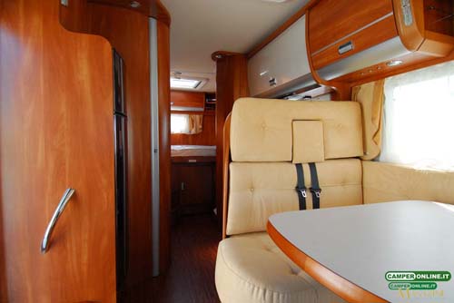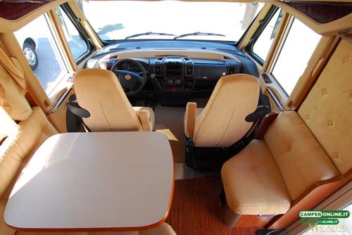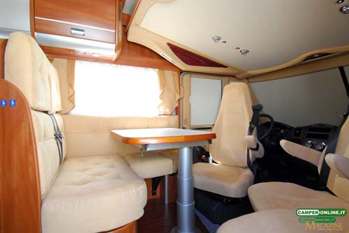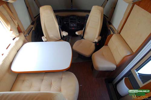 Il buon sfruttamento degli spazi interni assicura un’ambiente ampio, dalla buona abitabilità, anche in considerazioni delle dimensioni del veicolo contenute entro i sette metri. Il living anteriore, pur non essendo tra i più ampi si rivela razionale e confortevole, in grado di accogliere comodamente intorno al tavolo l’equipaggio al completo; interessante al riguardo la possibilità di ottenere due diverse altezze del piano. Le sedute sono ergonomiche e la qualità di imbottiture e tappezzerie, disponibili in ben otto diverse varianti, sono all’altezza della qualità generale del veicolo e assicurano ampie possibilità di personalizzazione.