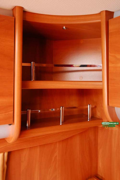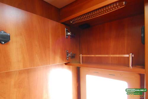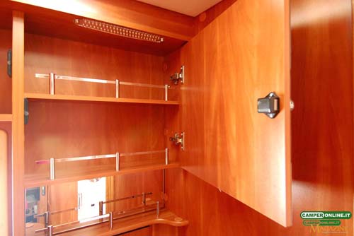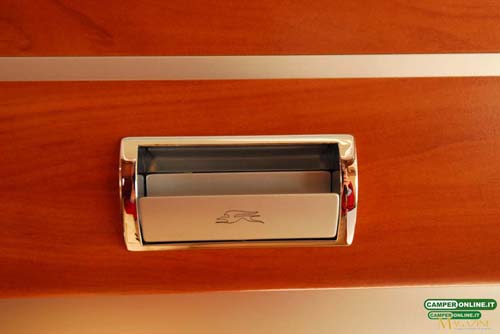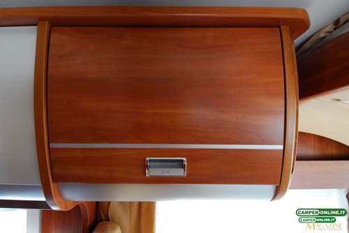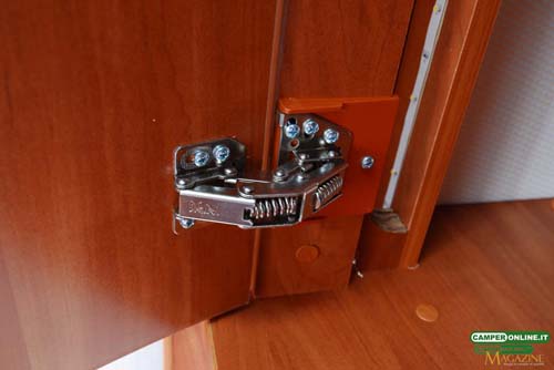 Il pensile del blocco cucina sfrutta le particolari e pregiate cerniere Aventos HK-S Blum a movimentazione assistita, mentre quelli del living e della camera da letto posteriore si avvalgono su cerniere DGN a doppia molla, capaci di mantenere le ante aperte senza necessità di ricorrere ai pistoncini a gas: non mancano, naturalmente, le aerazioni anticondensa posteriori e da rimarcare è imoltre la qualità di maniglie e serrature.