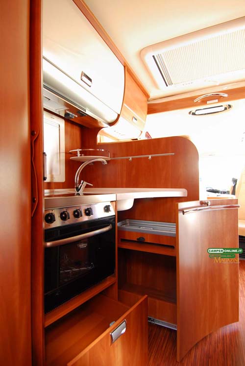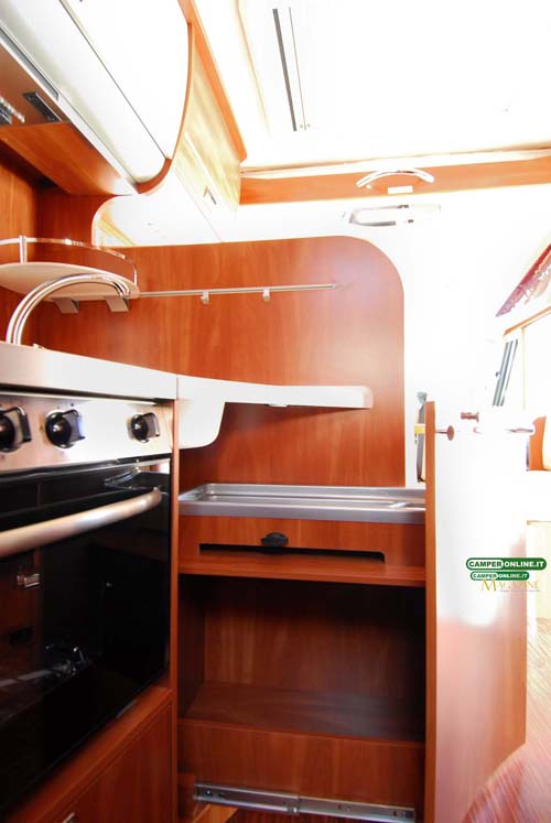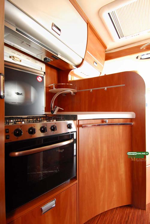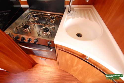L’aerazione avviene attraverso il pavimento, dotato di apposite feritoie, mentre di serie sono presenti l’interruttore inerziale MonoControl CS e i classici ganci ferma bombola. L’impianto è realizzato con tubi in acciaio e si avvale di tre rubinetti sezionatori posizionati sotto al blocco cucina.